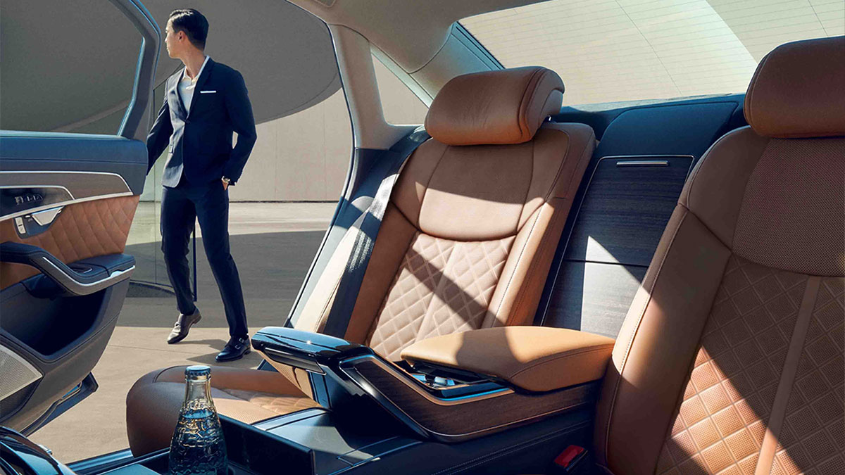 Tận hưởng một không gian nội thất cực kỳ rộng rãi và thoải mái với vị trí ngồi đặc biệt phía sau. Nội thất của A8 L như một phòng chờ rộng rãi, được thiết kế riêng biệt mang đến một trải nghiệm không gian mở và thư thái kết hợp với kiến trúc tập trung vào chiều ngang làm tô thêm điểm nhấn về chiều rộng của xe.
