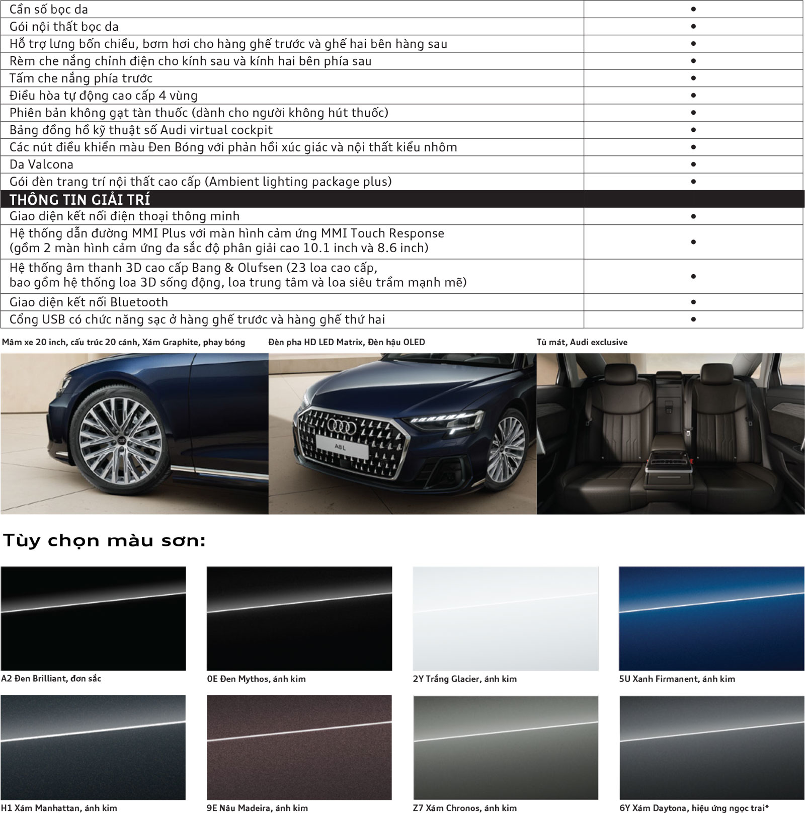 Audi A8 L 55 TFSI quattro sử dụng động cơ xăng 3.0 TFSI với công suất lên tới 250 kW (340 mã lực), đạt mô-men xoắn 500 Nm trong dải vòng tua từ 1.370 tới 4.500 vòng / phút, tăng tốc từ 0 tới 100 km/h chỉ trong 5,7 giây. Tại Việt Nam, Audi A8 L hiện có 3 phiên bản: Classic, Plus và Premium. Mức tiêu thụ nhiên liệu và phát thải CO₂ sẽ phụ thuộc vào mâm / lốp mà xe sử dụng.