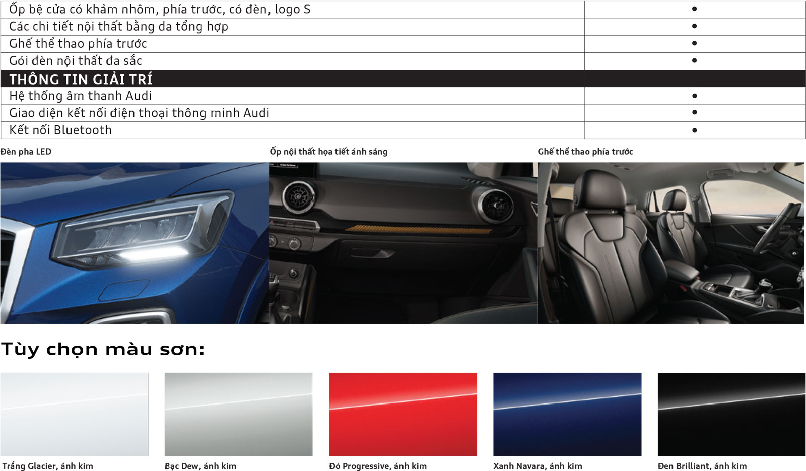 Q2 được trang bị vành hợp kim 17-inch với thiết kế 5 chấu chữ V. Ngoài ra, phiên bản S-line được trang bị ốp màu bạc Selenite ở phần trụ C, ấn tượng hơn bởi nội thất nhôm cùng các phần ốp bằng nhôm phay mờ, bệ cửa trước cũng được khảm nhôm phát sáng với logo chữ “S”, cản sau của phiên bản S-line được sơn hoàn thiện toàn bộ.