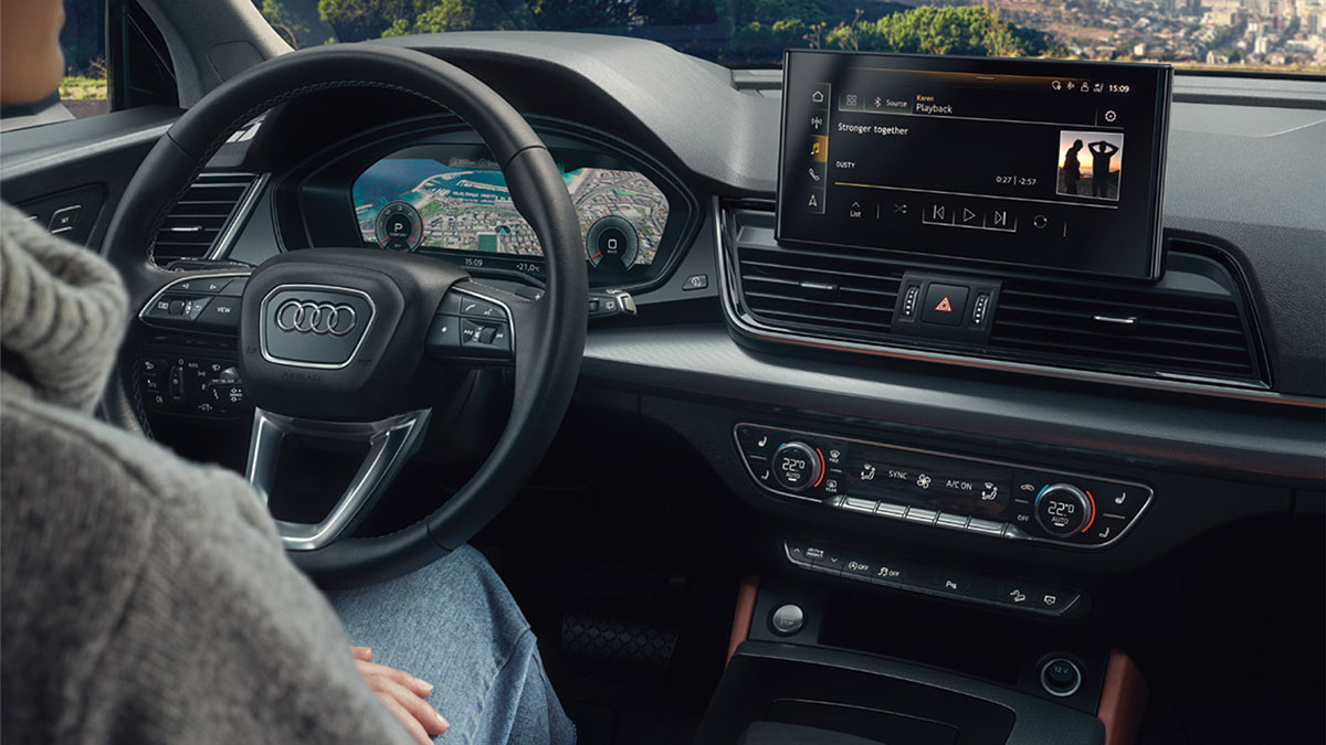 Buồng lái ảo kỹ thuật số Audi Virtual Cockpit kết hợp hệ thống hiển thị thông tin trên kính lái (HUD) mang đến cảm giác lái thực sự phấn khích. Tất cả các điều khiển đều nằm trong tầm tay: trên vô lăng thể thao đa chức năng được bọc da, hoặc màn hình giải trí MMI cảm ứng 10.1-inch. Kết nối điện thoại cũng dễ dàng hơn thông qua ứng dụng Audi Smartphone Interface, Bluetooth và giao diện âm nhạc Audi. Hệ thống âm thanh 3D cao cấp Bang & Olufsen được trang bị tiêu chuẩn trên phiên bản Audi Q5 S-line.